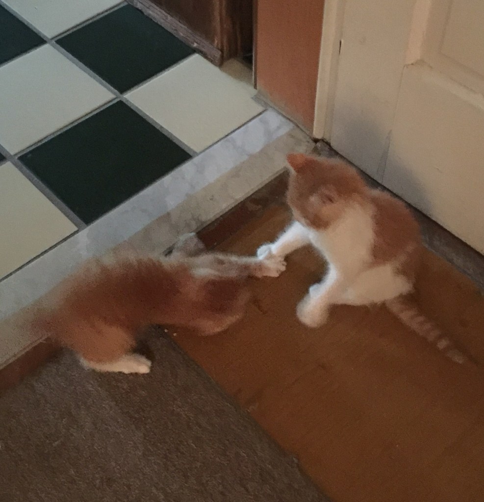 I got Lucy and Leo as kittens. My son had found two small kittens that could be held in the palm of your hand. Leo was so small when he first arrived at my home. He managed to slide under my stove and hide. Lucy I could feel her little bones because they had been starving. Well, they got chubby pretty quickly when I adopted them.
